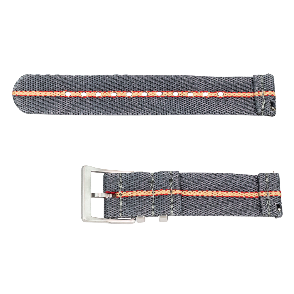 The Grey-Red-Khaki 2-Piece Slanted Ballistic features two individual straps that eliminate bulk under the watch. This creates a comfortable, low-profile fit on your wrist while retaining the double-pass security system that keeps your watch firmly attached during your adventures (inspired by Clockwork Synergy’s product concept and general knowledge of Ballistic straps). The color combination adds a pop of personality, perfect for those who like to stand out.