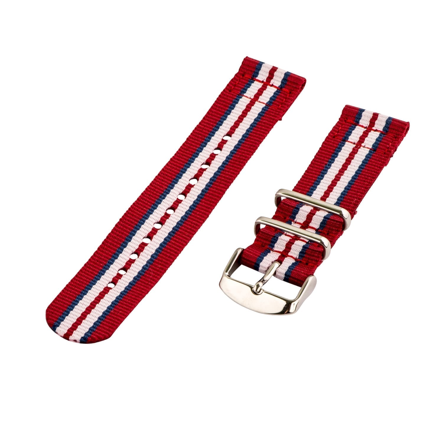 These are 2-piece red/blue/white Classic Ballistic bands. In contrast to the Classic Ballistic strap, these watch bands also include stitching for an added layer of durability. Made from high-quality nylon creating a comfortable feel around the wrist. Available with either an authentic stainless steel or PVD black buckle/hardware.