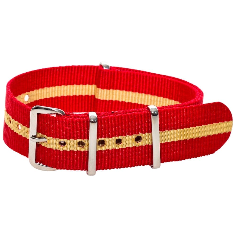 This is a red & khaki Classic Ballistic strap offered in 16mm-20mm sizes. Crafted from high-quality nylon for a durable, comfortable design! This design has authentic stainless steel hardware and a buckle for the perfect finishing touch. Length is 273mm (10.75 inches) which will fit most wrist sizes!
