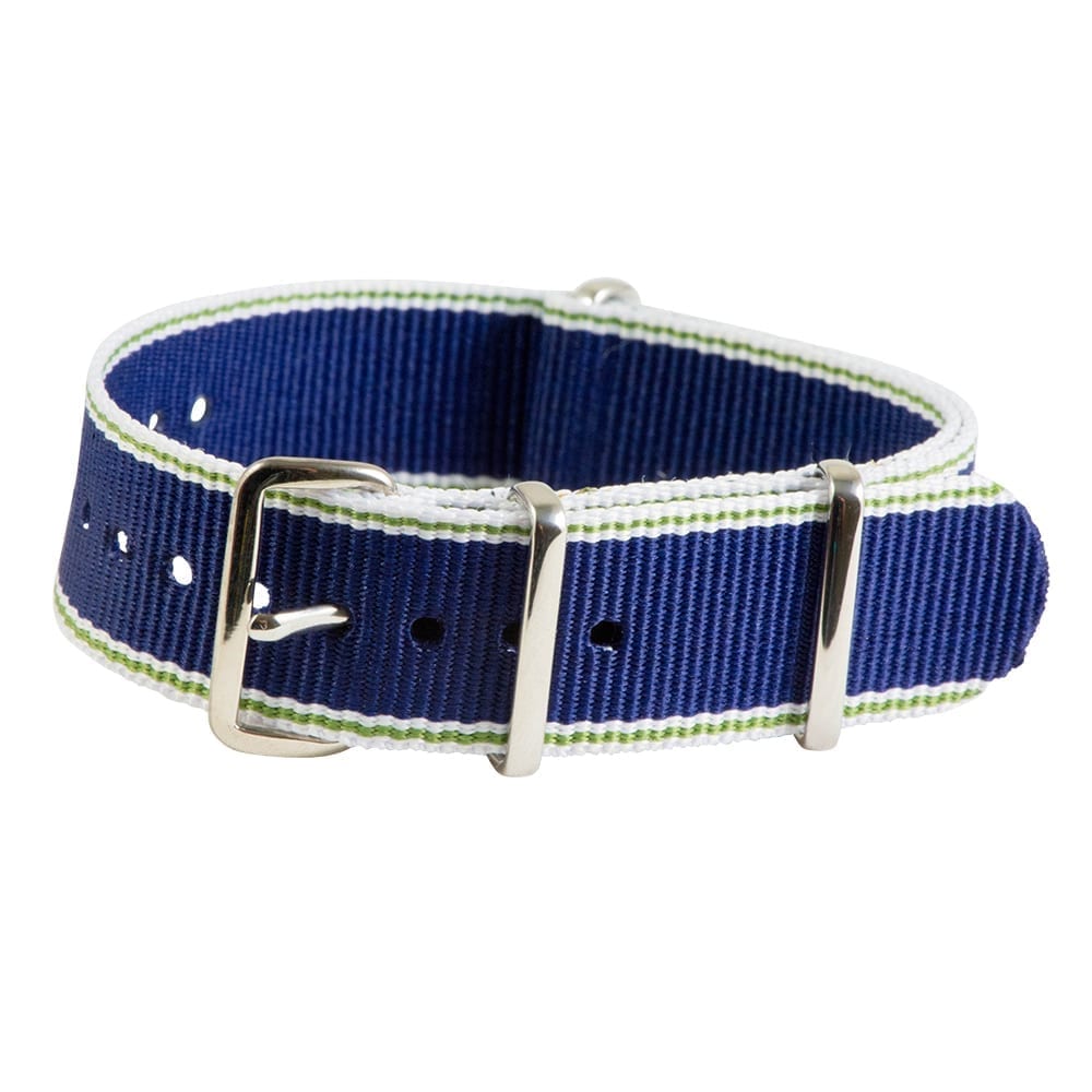 This is a white/green/navy Classic Ballistic strap offered in 20mm. Crafted from high-quality nylon for a durable, comfortable design! This design has authentic stainless steel hardware and a buckle for the perfect finishing touch. Length is 273mm (10.75 inches) which will fit most wrist sizes!