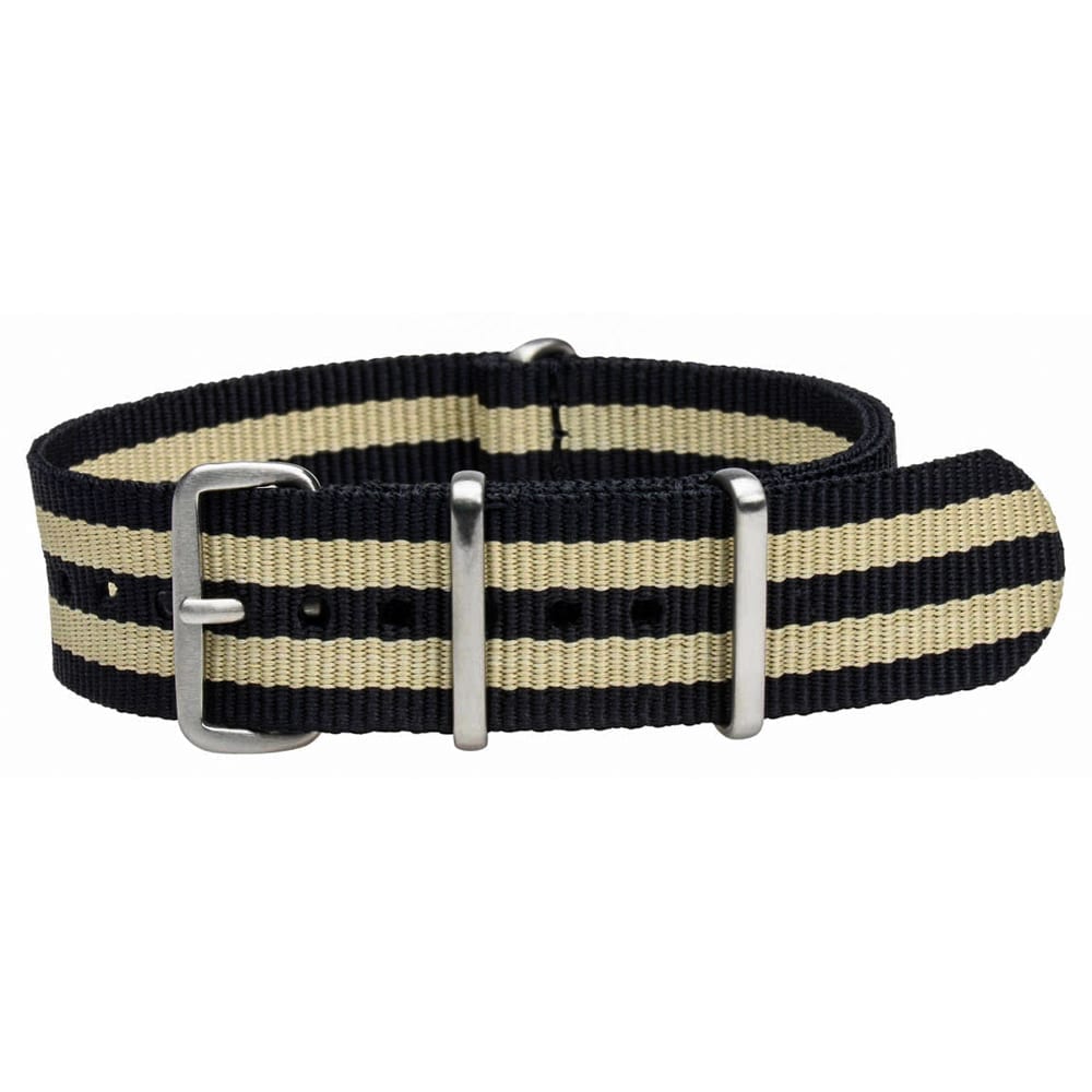 A Black & Khaki Premium Ballistic Strap made from quality Nylon and offered with Brushed Steel hardware. Crafted with double-stitching at the buckle for added durability. Specifications include a 270mm length and 1.25mm thickness. There are 13 adjustability holes to fit most wrist sizes.
