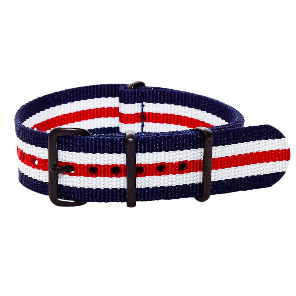 A Blue/Red/White Premium Ballistic Strap made from quality Nylon and offered with multiple buckle/hardware color options. Crafted with double-stitching at the buckle for added durability. Specifications include a 270mm length and 1.25mm thickness. There are 13 adjustability holes to fit most wrist sizes.