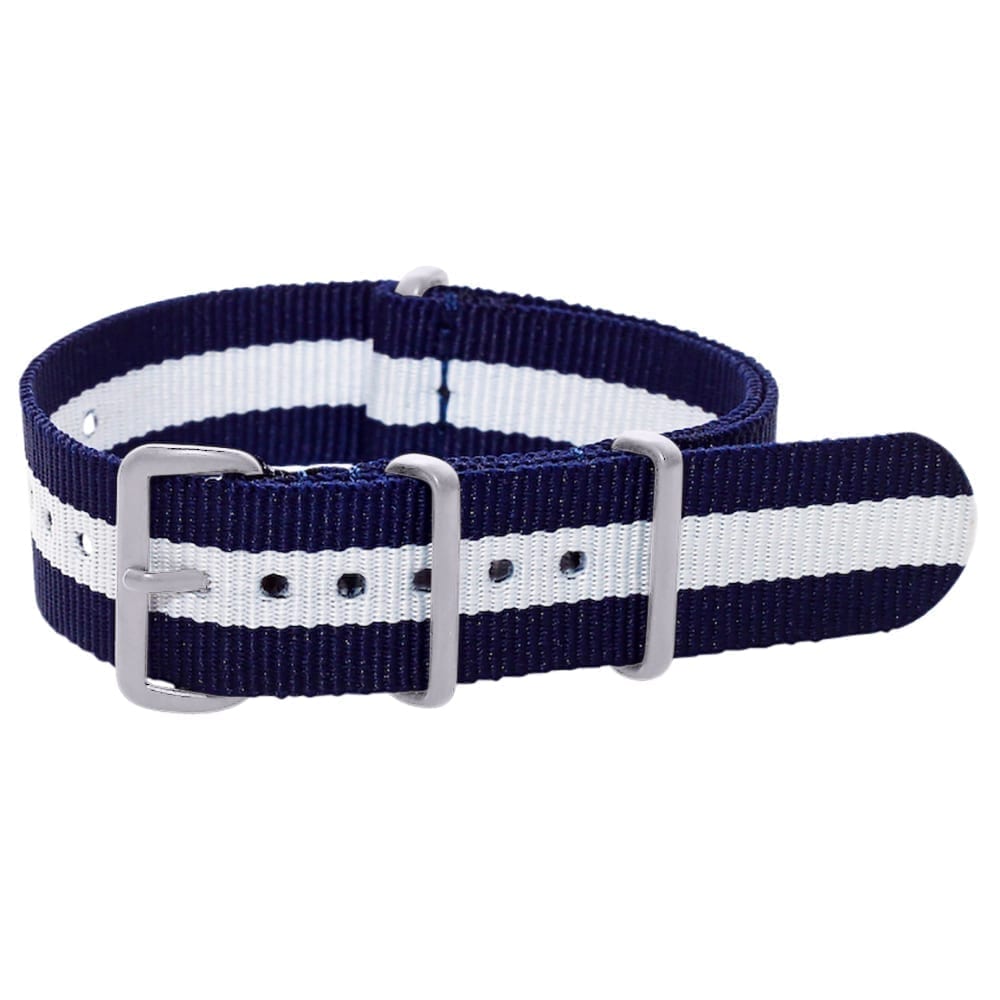 A Navy & White Premium Ballistic Strap made from quality Nylon and offered with multiple buckle/hardware color options. Crafted with double-stitching at the buckle for added durability. Specifications include a 270mm length and 1.25mm thickness. There are 13 adjustability holes to fit most wrist sizes.