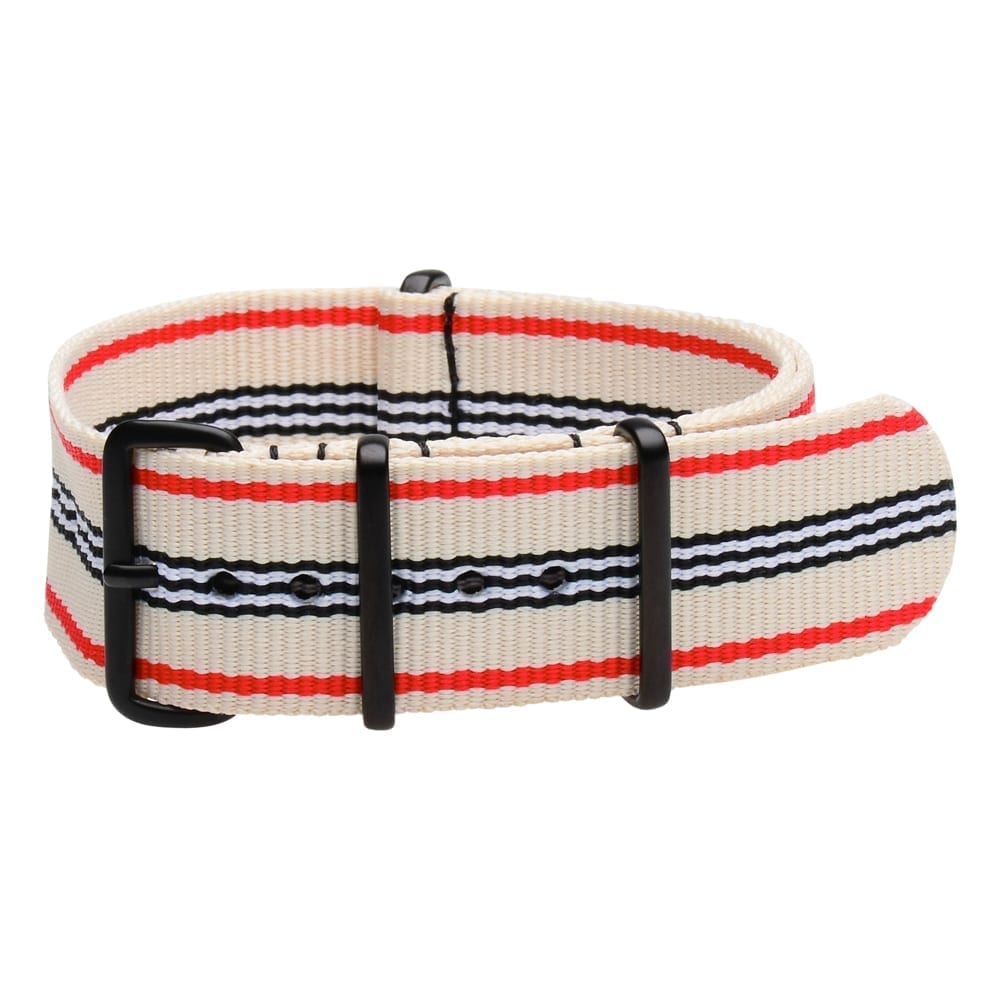 A White/Navy/Red Premium Ballistic Strap made from quality Nylon and offered with multiple buckle/hardware color options. Crafted with double-stitching at the buckle for added durability. Specifications include a 270mm length and 1.25mm thickness. There are 13 adjustability holes to fit most wrist sizes.