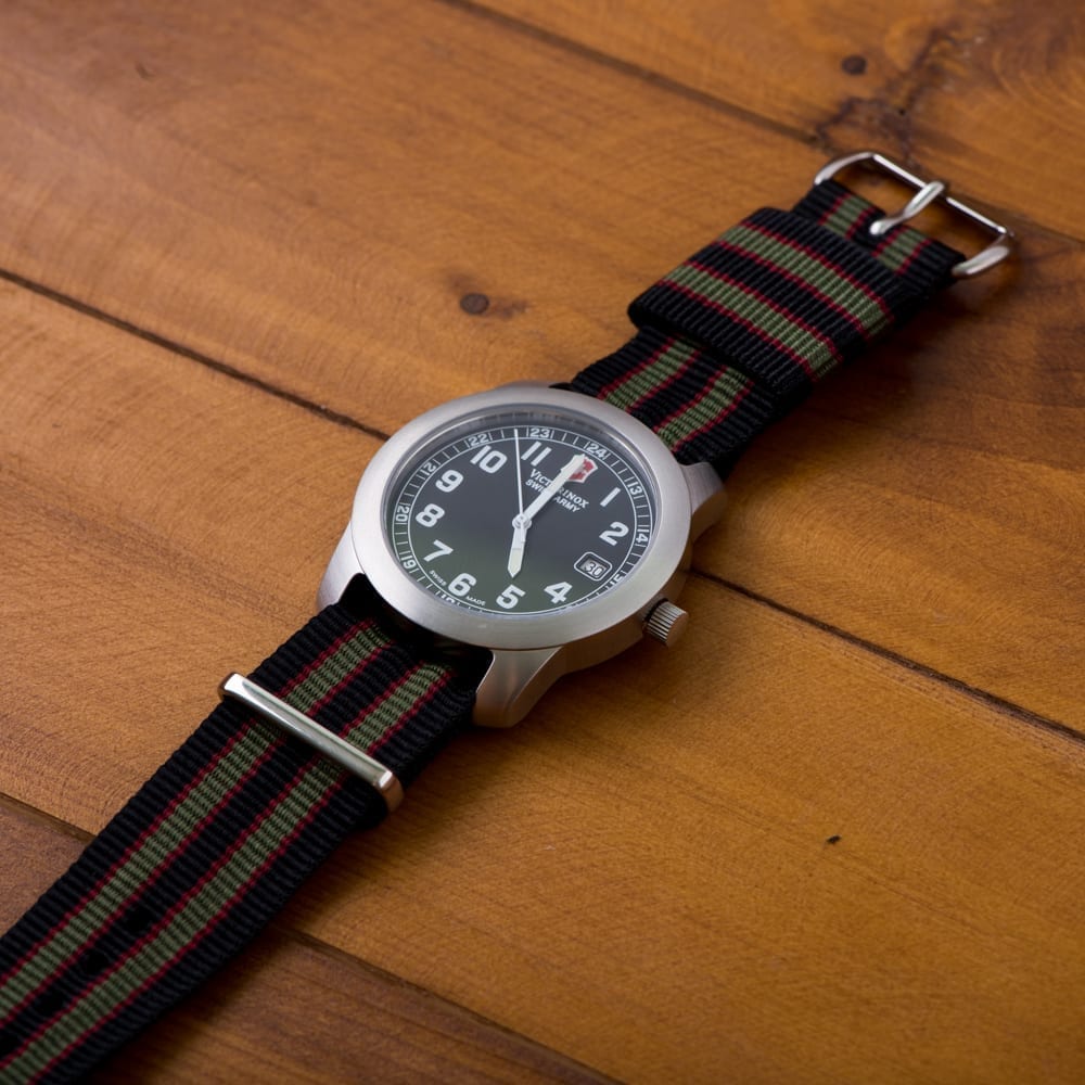 This is a black/green/red RAF Ballistic watch strap available in 18mm-22mm sizes. Crafted with high-quality nylon for a secure, comfortable attachment. The buckle is made from authentic stainless steel. The RAF Ballistic strap has an additional fixed nylon keeper for attachment to watch face.