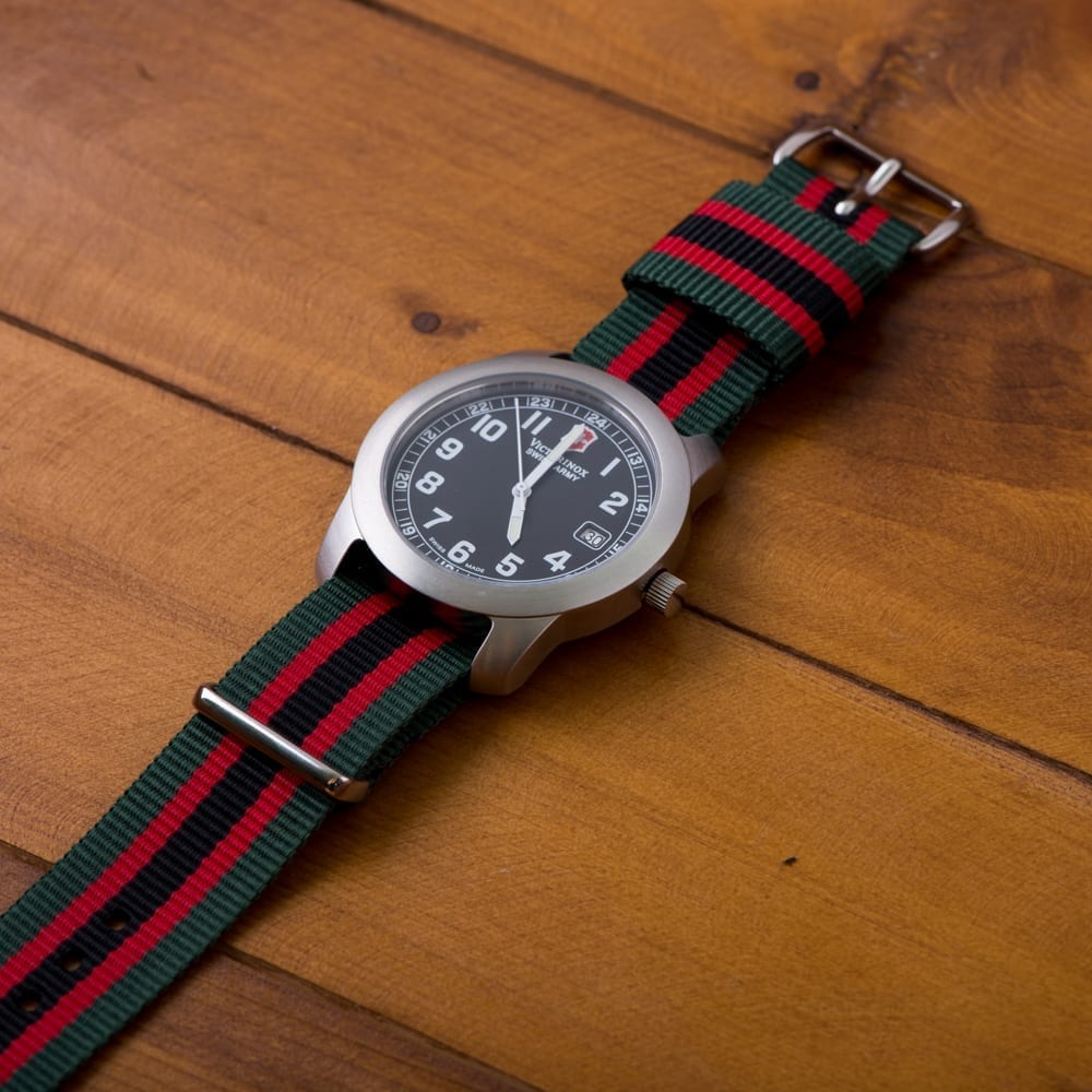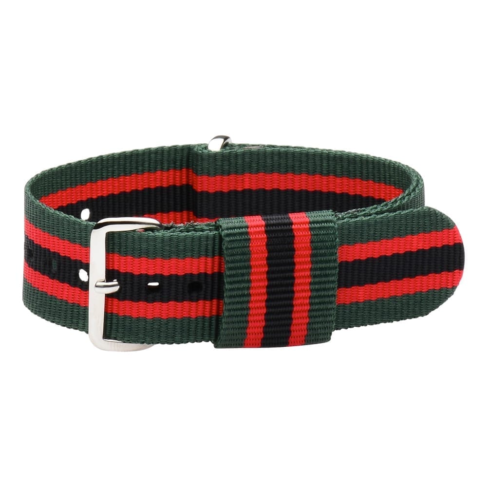This is a Green/Red/Black RAF Ballistic Watch Strap available in 18mm – 22mm. Crafted with high-quality nylon for a secure, comfortable attachment. The buckle is made from authentic stainless steel. The RAF Ballistic strap has an additional fixed nylon keeper for attachment to watch face.