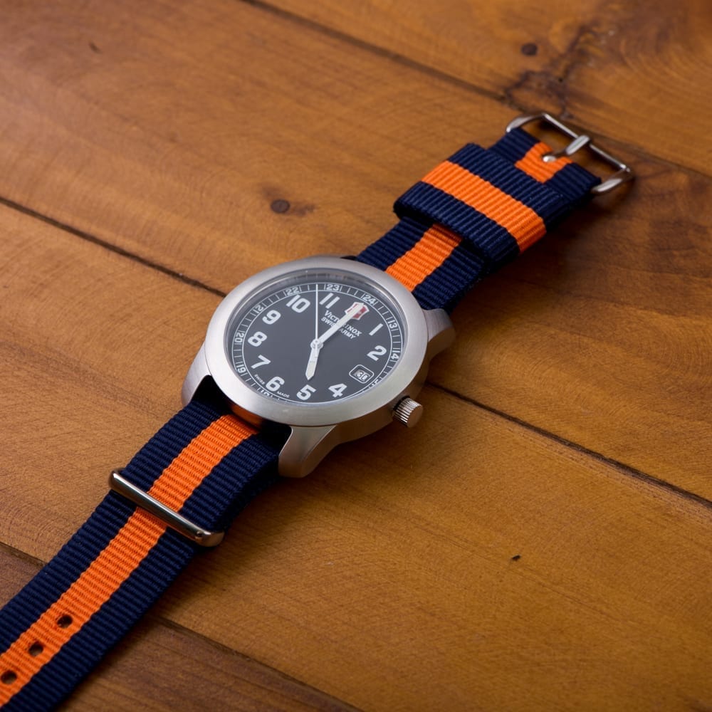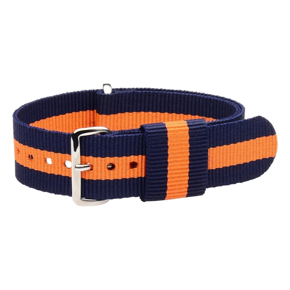 This is a Navy & Orange RAF Ballistic Watch Strap available in multiple sizes. Crafted with high-quality nylon for a secure, comfortable attachment. The buckle is made from authentic stainless steel. The RAF Ballistic strap has an additional fixed nylon keeper for attachment to watch face.