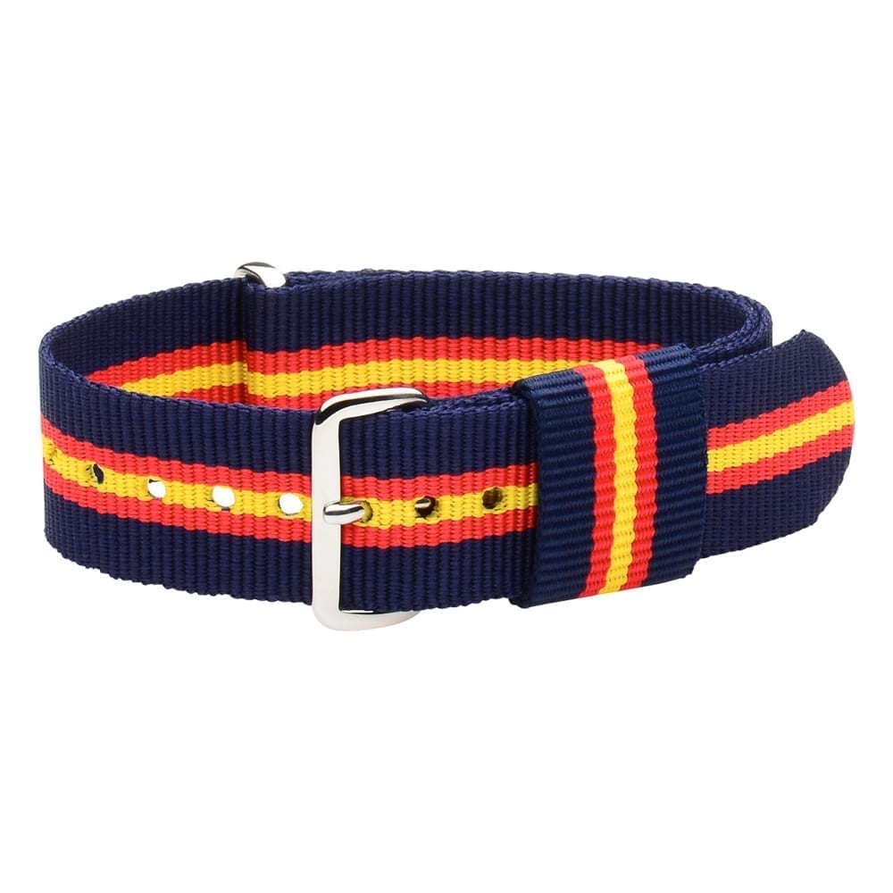 This is a Navy/Red/Yellow RAF Ballistic Watch Strap available in 18mm – 20mm. Crafted with high-quality nylon. The buckle is made from authentic stainless steel. The RAF Ballistic strap has an additional fixed nylon keeper for attachment to watch face.
