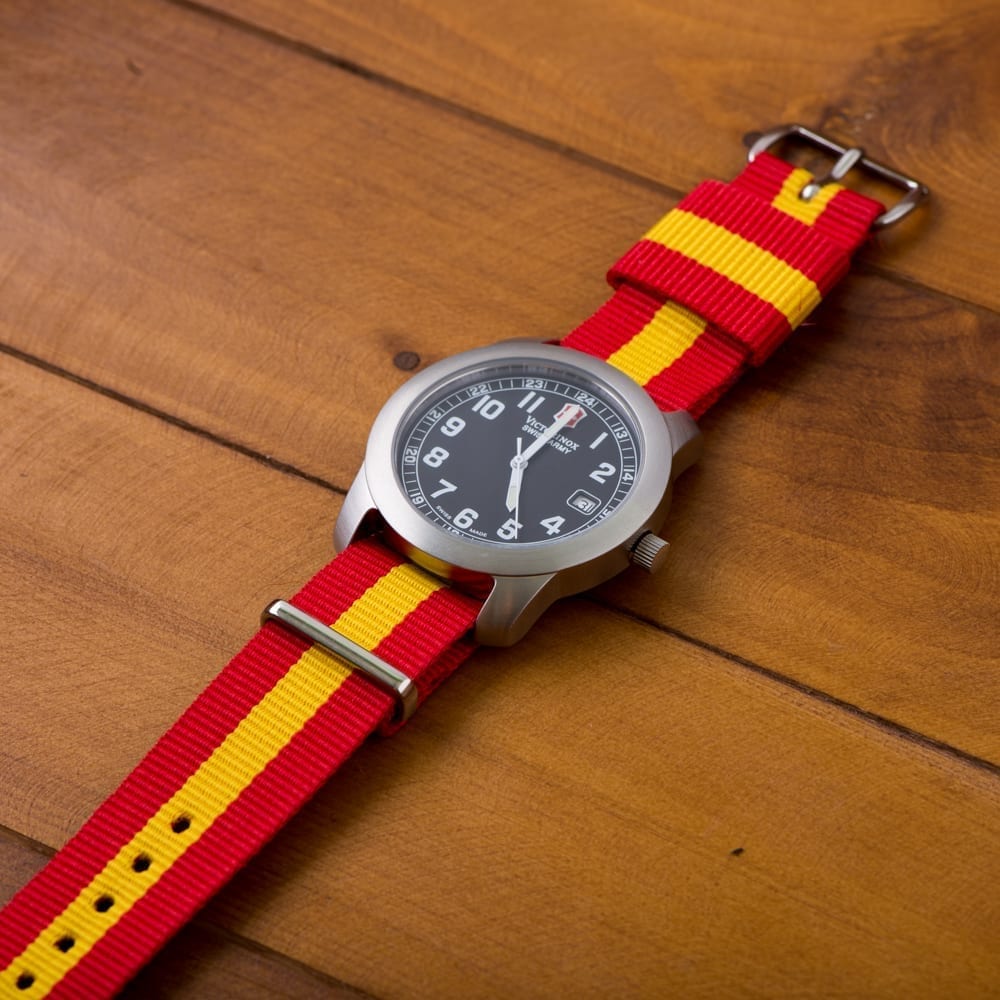 This is a Red & Yellow RAF Ballistic Watch Strap available in 20mm. Crafted with high-quality nylon for a secure, comfortable attachment. The buckle is made from authentic stainless steel. The RAF Ballistic strap has an additional fixed nylon keeper for attachment to watch face.