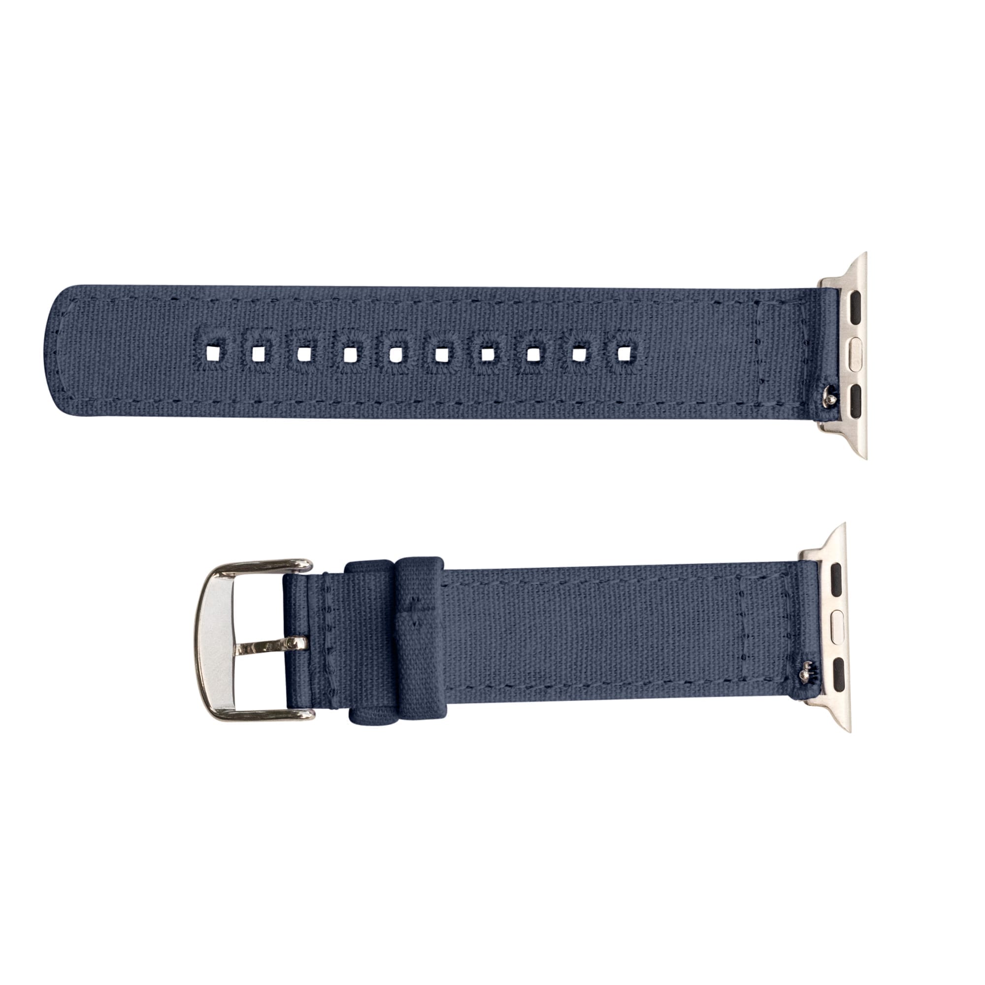 A pair of Dark Grey Canvas Fabric watch bands (in two pieces) for Apple Watch series 1, 2, and 3. Quick-release watch bands with pre-installed apple adapters make it easy to install or remove our bands from your Apple Watch. Double layered and stitched canvas fabric material. Soft against the wrist and vibrant in color. Stain resistant and easy to clean. Available with multiple hardware options. No tools needed to install these watch bands.