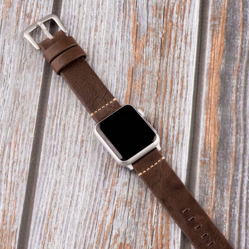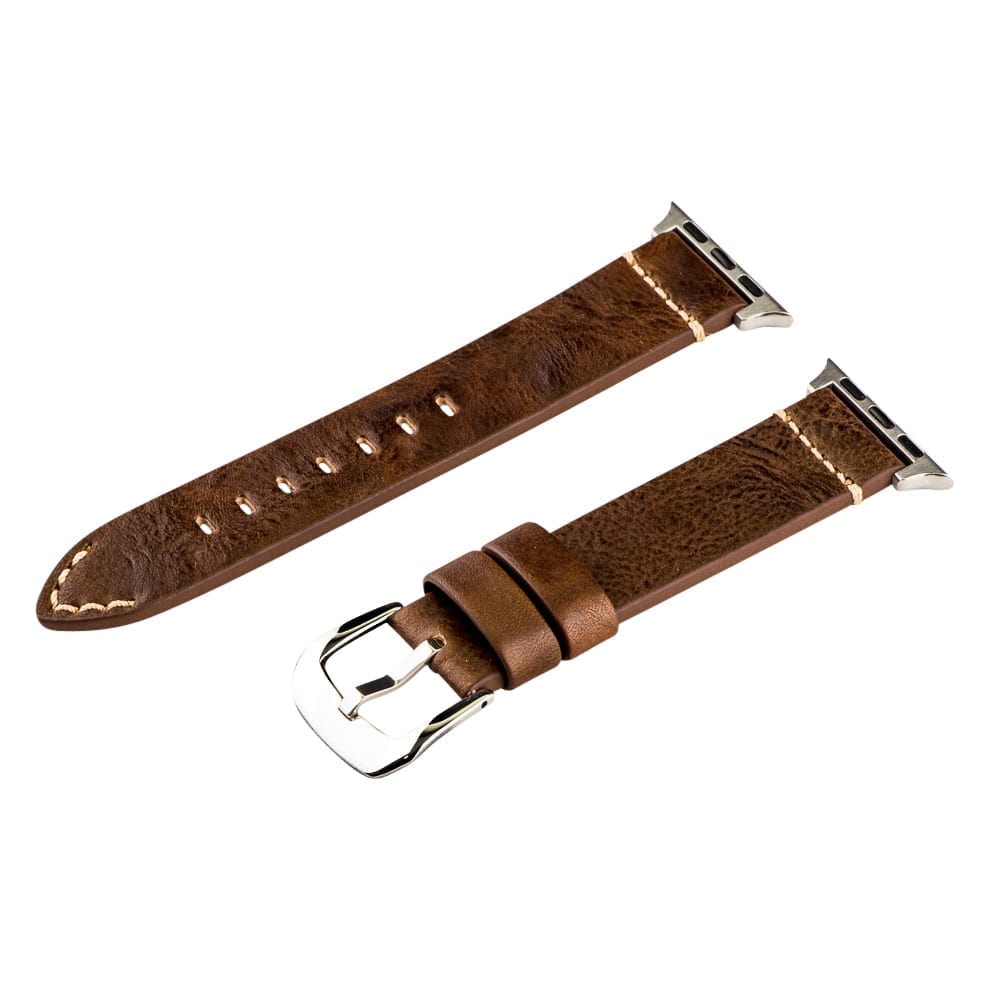 A pair of Brown Vintage Leather Bands for Apple Watch® in 38mm & 42mm. These are a recent addition to our Dapper Collection. Crafted with 100% Genuine Leather for a comfortable feel on the wrist and durable set of Watch Bands. Each set have built-in Quick Release Pins and compatible Apple Watch® adapters which allow for a speedy attachment. These adapters can be used with most watch bands that accept Quick Release Pins!