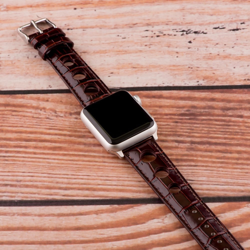 This is a pair of brown 3-hole Croco rally bands for Apple Watch®. Crafted from 100% genuine leather for a set of secure watch bands to hold your timepiece. There are multiple color options for selection regarding both the buckles and adapters. Thickness is 4mm at the center. There are 8 adjustability holes for a better attachment to the wrist.