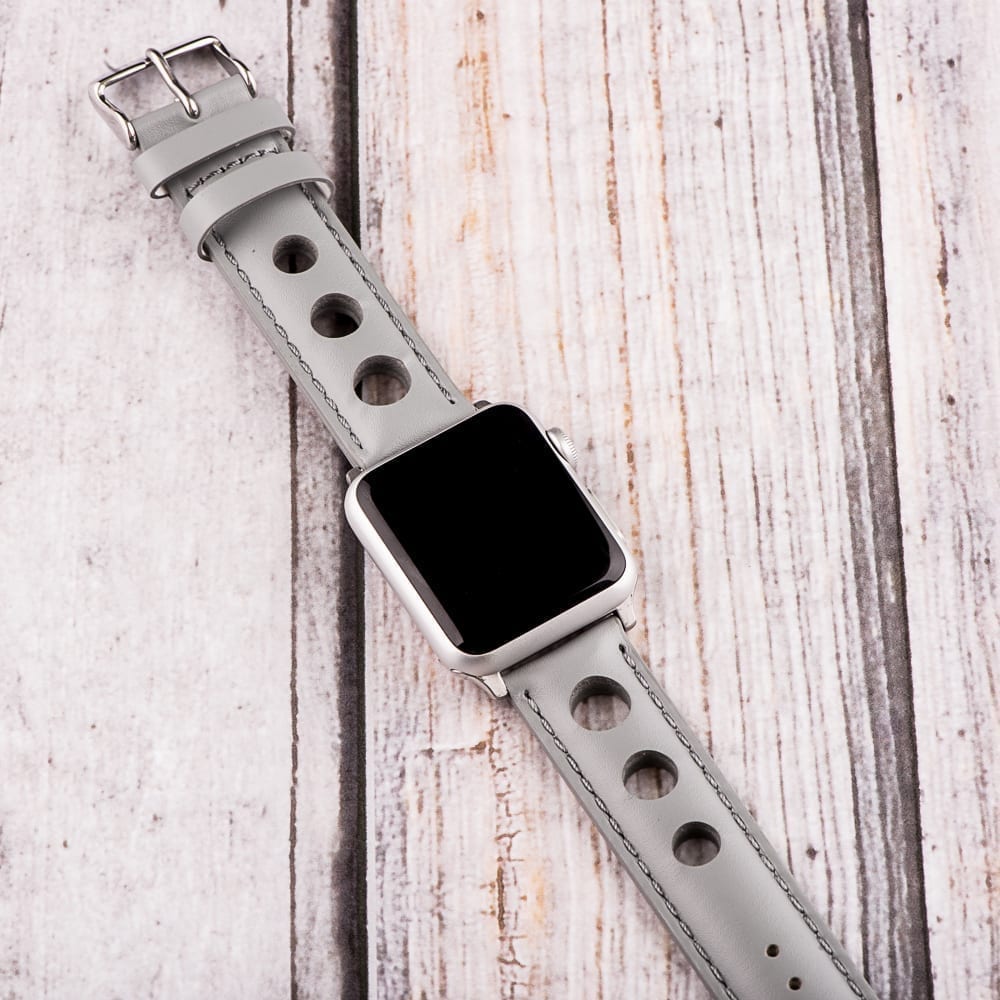 This is a pair of grey 3-hole Smooth Rally bands for Apple Watch®. Crafted from 100% genuine leather for a set of secure watch bands to hold your timepiece. There are multiple color options for selection regarding both the buckles and adapters. Thickness is 4mm at the center. There are 8 adjustability holes for a better attachment to the wrist.