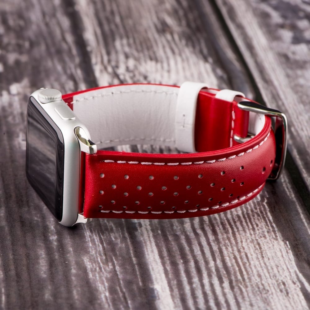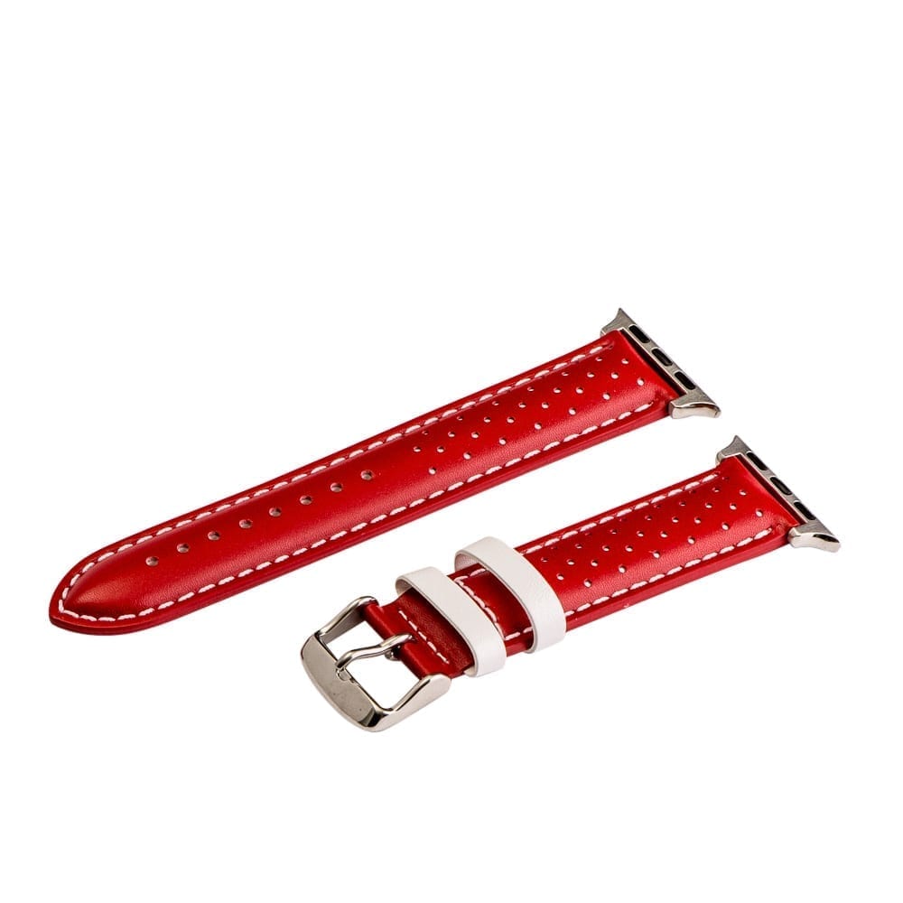 This is a pair of red & white Smooth Perforated Rally bands for Apple Watch®. Crafted from 100% genuine leather for a set of secure watch bands to hold your timepiece. There are multiple color options for selection regarding both the buckles and adapters. Thickness is 4mm at the center. There are 8 adjustability holes for a better attachment to the wrist.