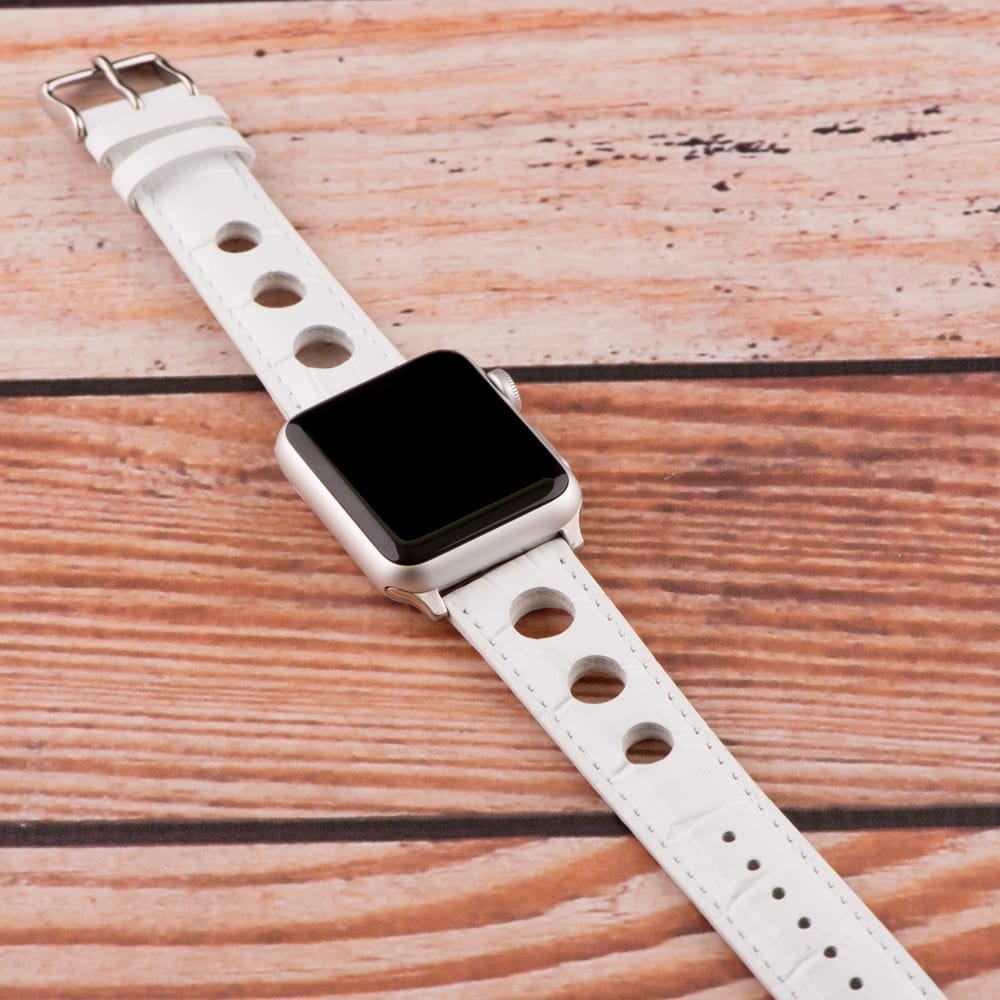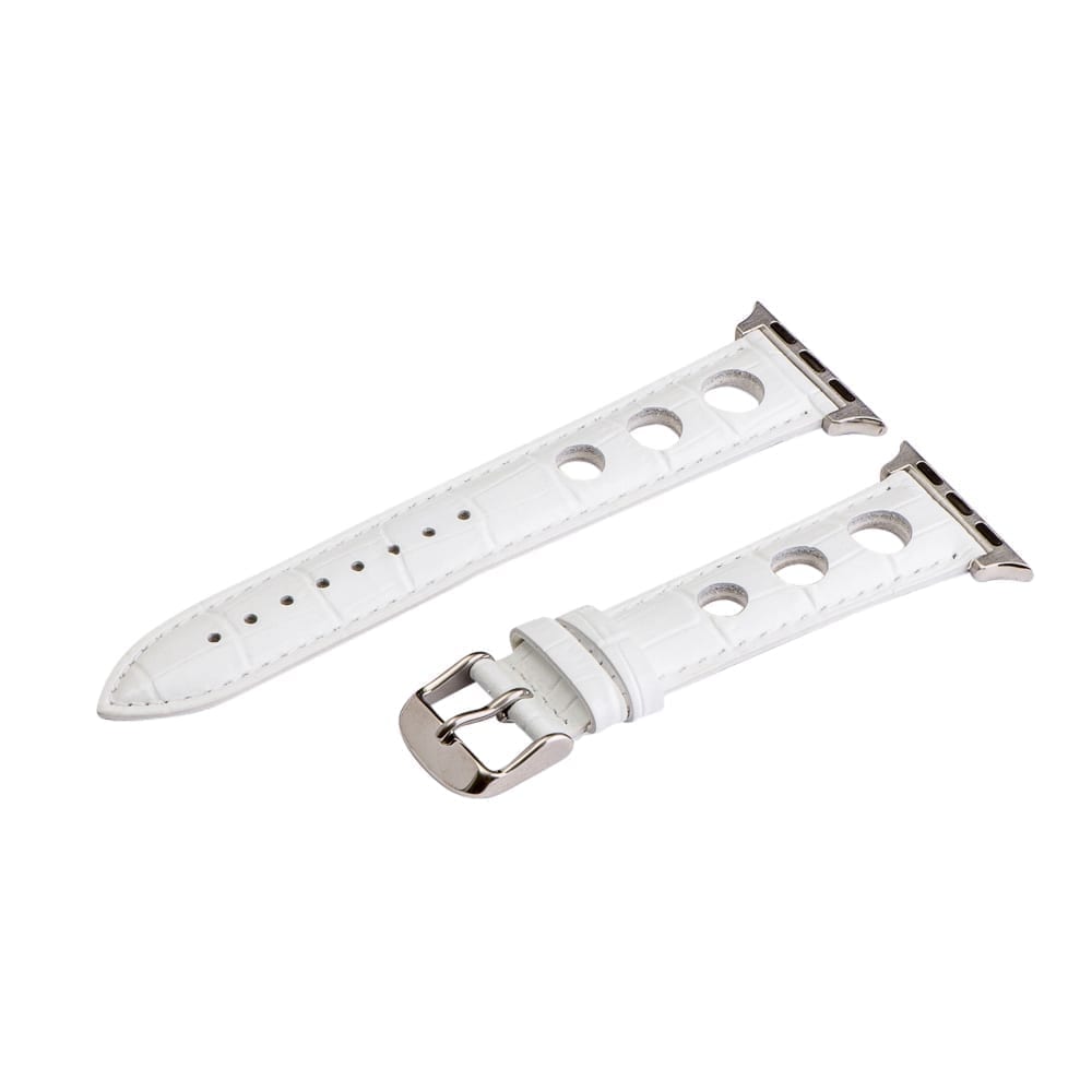 This is a pair of white 3-hole Croco Rally bands for Apple Watch®. Crafted from 100% genuine leather for a set of secure watch bands to hold your timepiece. There are multiple color options for selection regarding both the buckles and adapters. Thickness is 4mm at the center. There are 8 adjustability holes for a better attachment to the wrist.