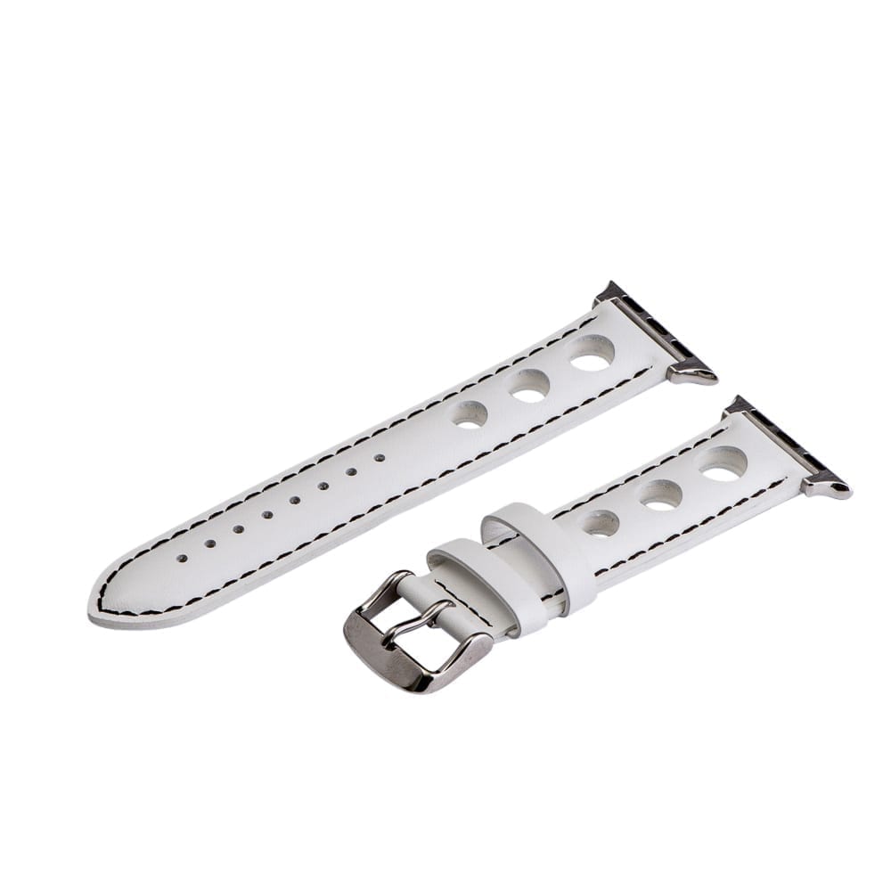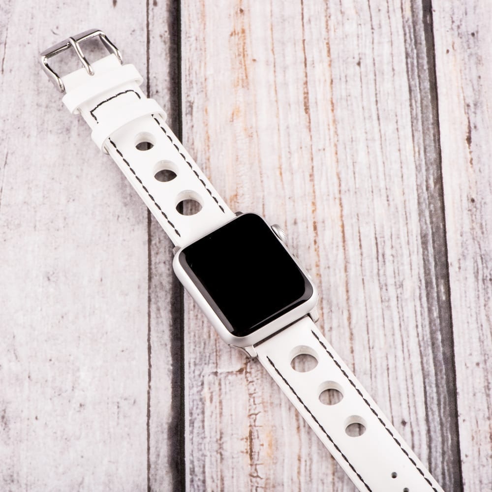 This is a pair of white & black 3-hole Smooth Rally bands for Apple Watch®. Crafted from 100% genuine leather for a set of secure watch bands to hold your timepiece. There are multiple color options for selection regarding both the buckles and adapters. Thickness is 4mm at the center. There are 8 adjustability holes for a better attachment to the wrist.