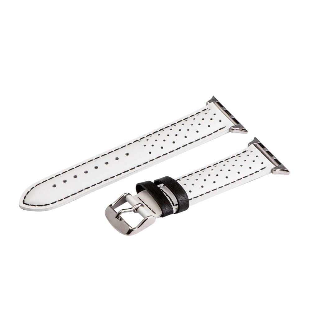 This is a pair of white & black Smooth Perforated Rally bands for Apple Watch®. Crafted from 100% genuine leather for a set of secure watch bands to hold your timepiece. There are multiple color options for selection regarding both the buckles and adapters. Thickness is 4mm at the center. There are 8 adjustability holes for a better attachment to the wrist.
