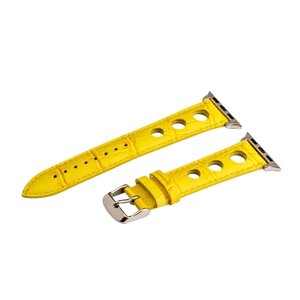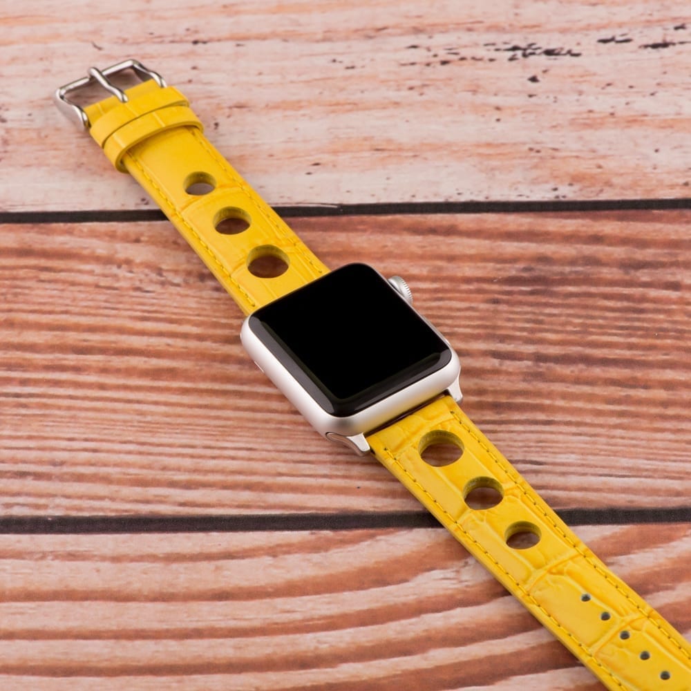 This is a pair of yellow 3-hole Croco Rally bands for Apple Watch®. Crafted from 100% genuine leather for a set of secure watch bands to hold your timepiece. There are multiple color options for selection regarding both the buckles and adapters. Thickness is 4mm at the center. There are 8 adjustability holes for a better attachment to the wrist.